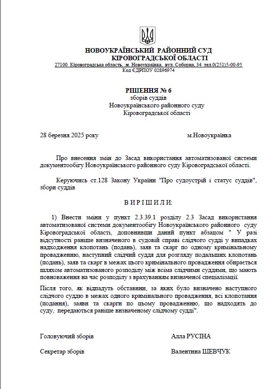 РІШЕННЯ № 6 зборів суддів Новоукраїнського районного суду Кіровоградської області
